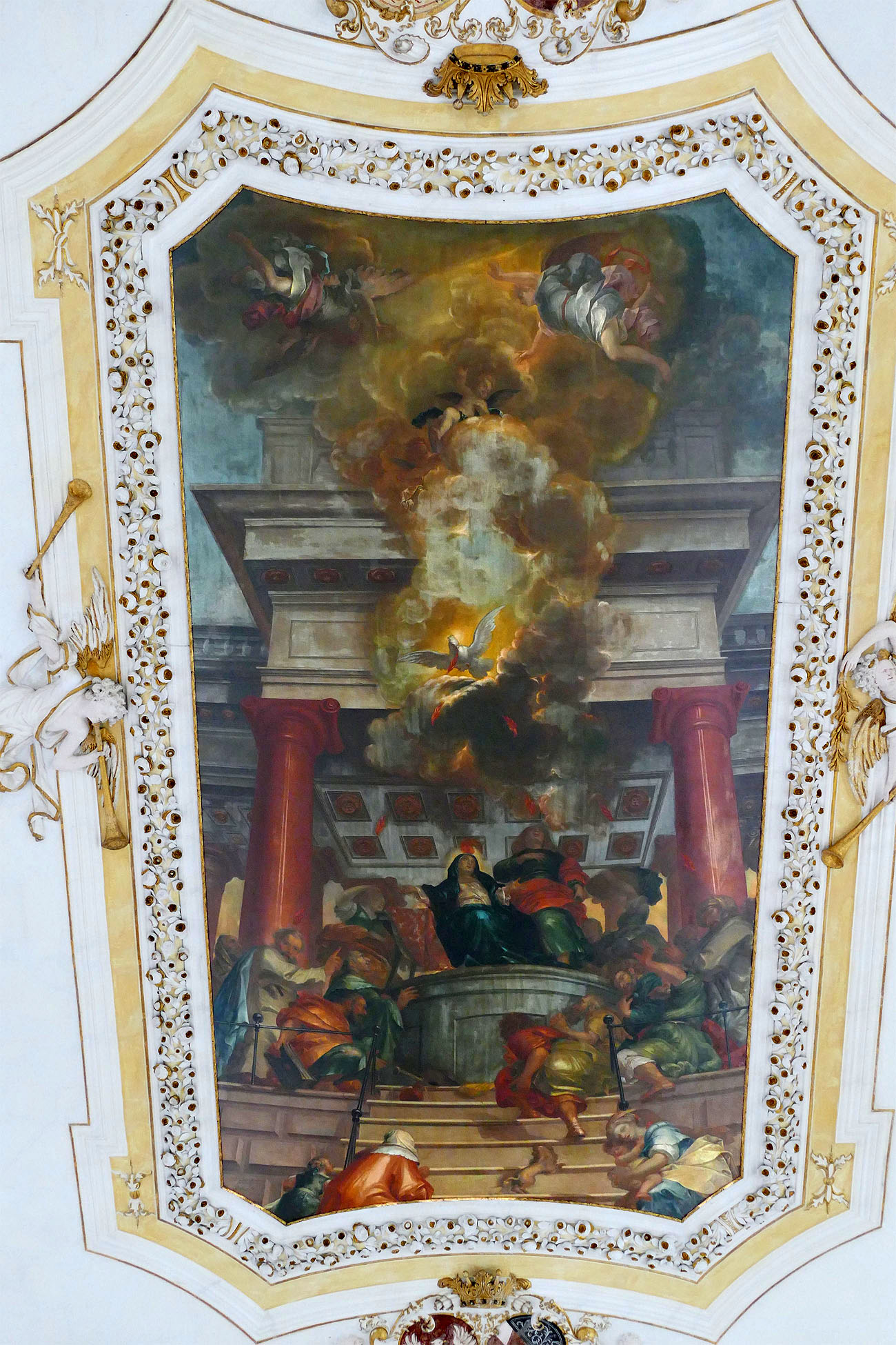 (ssg) Wieder jährt sich der Tag, an dem Pfingsten – die Entsendung des Heiligen Geistes – begangen wird. Passend zu diesem Feiertag findet sich in Kloster und Schloss Salem im Kaisersaal ein prächtiges Deckengemälde. Dieses illustriert in eindrucksvoller Weise das Ereignis.