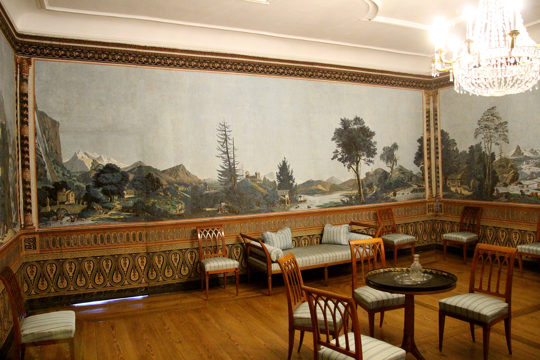 Schloss Schwetzingen, Schweizer Tapete im Appartement der Reichsgräfin von Hochberg im 2. Obergeschoss.