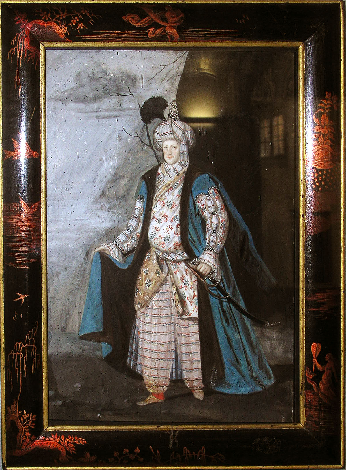 Markgraf Ludwig Wilhelm von Baden-Baden im Kostüm eines oasmanischen Würdenträgers. Kostümbild in Schloss Favorite