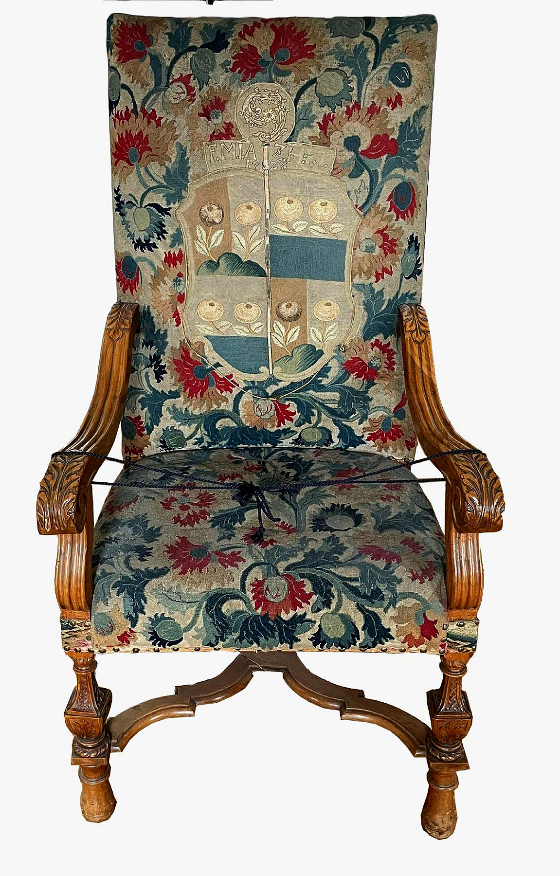 Reich verzierter Lehnstuhl mit dem Wappen der Heiligkreuztaler Äbtissin Maria Josepha von Holzapfel, 18. Jh. Foto: SSG.