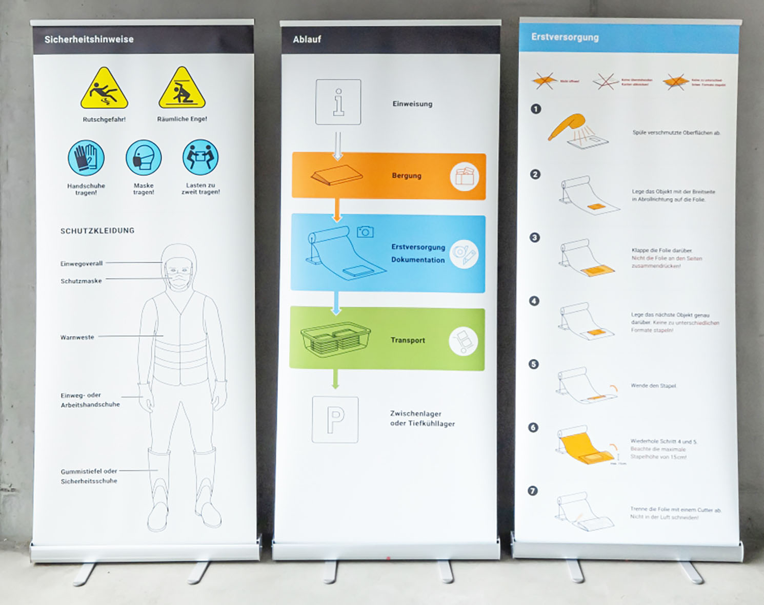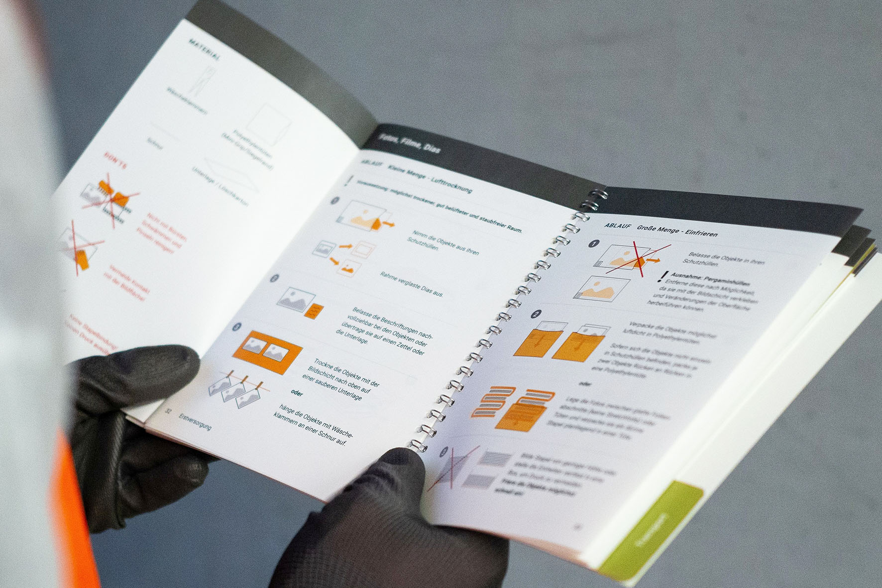 Die fachgerechte Erstversorgung der verschiedenen Objektarten wird durch schnell verständliche Illustrationen und ein visuelles Leitsystem übersichtlich angeleitet. (Foto: Tobias Moser)