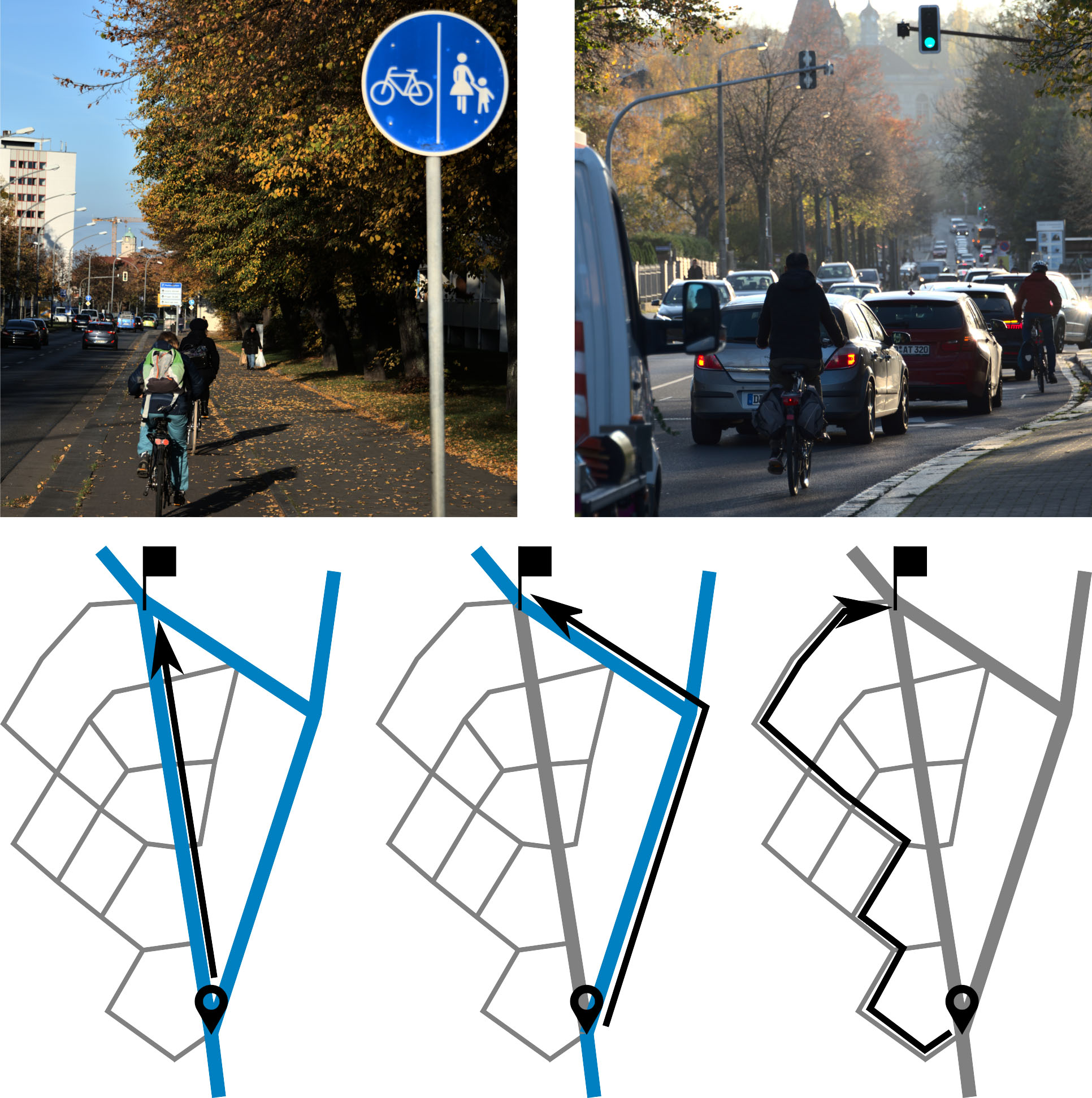 Die Routenwahl von Radfahrer:innen unterliegt diversen Entscheidungsfaktoren. So bevorzugen viele einen separaten Radweg (oben links), anstatt sich den Platz mit dichtem Autoverkehr zu teilen (oben rechts). Je nachdem, ob Straßen mit viel Autoverkehr (dicke Kanten) mit dedizierten Radwegen ausgestattet sind (blau) oder nicht (grau), nehmen Radfahrer:innen die direkte Route (schwarzer Pfeil, unten links), nehmen Umwege in Kauf um auf Radwegen zu bleiben (unten Mitte) oder über kleine Nebenstraßen (dünne Kanten) zu fahren (unten rechts).