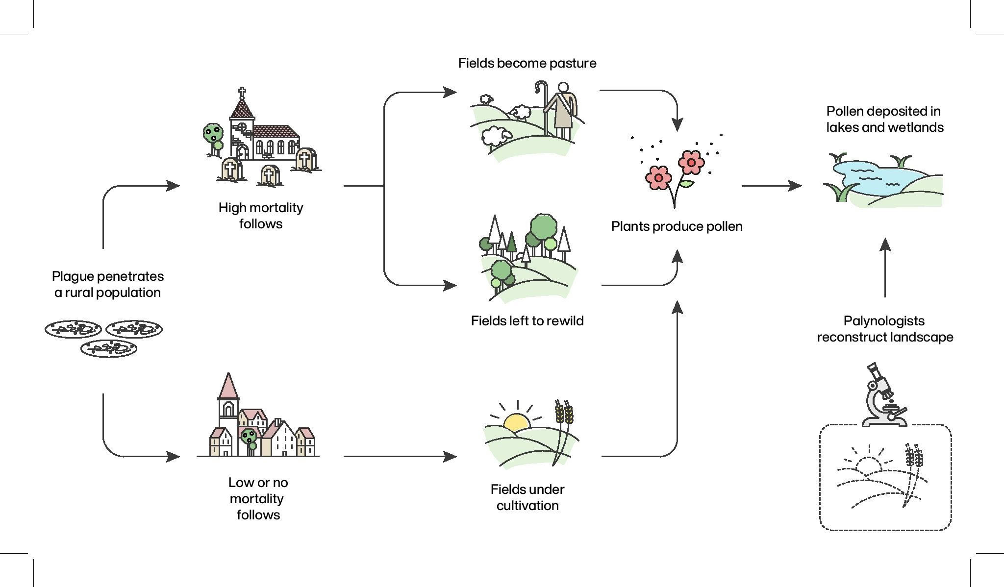 Die Palynologie – die Untersuchung von Sporen und Pollenkörnern – diente dabei als ein besonders wichtiges Werkzeug zur Untersuchung der demographischen Auswirkungen der Pest. Mithilfe eines neuen Ansatzes, genannt Big-data paleoecology (BDP), analysierten die Forscher*innen 1.634 Pollenproben, die in ganz Europa gesammelt wurden. Dadurch konnte das Team bestimmen, welche Pflanzen in welchen Mengen angebaut wurden und zeigen, in welcher Region der Ackerbau zum Stillstand kam, weiter betrieben wurde oder ob Wildpflanzen auf früheren Feldern nachwuchsen.