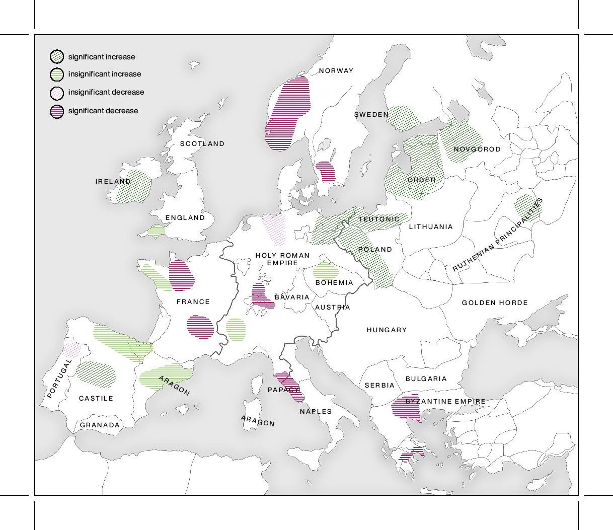 Einen besonders starken Rückgang landwirtschaftlicher Aktivität erlebten Skandinavien, Frank-reich, Südwestdeutschland, Griechenland und Mittelitalien. Dies korreliert mit den hohen Sterblichkeitsraten, die bereits in mittelalterlichen Quellen beschrieben wurden. Zentral- und Osteuropa sowie Teile Westeuropas, darunter Irland und die Iberische Halbinsel, zeigten hingegen Anzeichen für Kontinuität und ununterbrochenes Wachstum.
