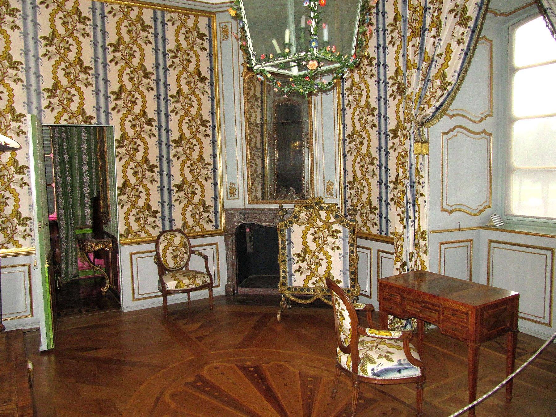 Schloss Schwetzingen: Kabinett des Kurfürsten Carl Theodor (oben, alte Beleuchtungsinstallation) und der Kurfürstin Elisabeth Augusta mit Blick in das winzige Schreibzimmer der Kurfürstin (unten). Foto: kulturer.be
