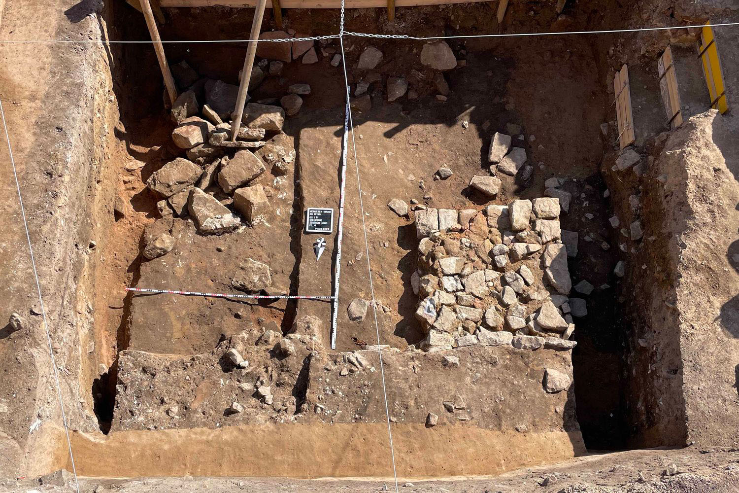 Grabungsschnitt im Bereich des Kreuzgangs an der Nordseite der Monumentalkirche. Rechts im Bild der Fundamentrest des bislang unbekannten, rätselhaften Bauwerks im Kreuzgang. Foto: Holger Grönwald, Landesamt für Denkmalpflege und Archäologie Sachsen-Anhalt