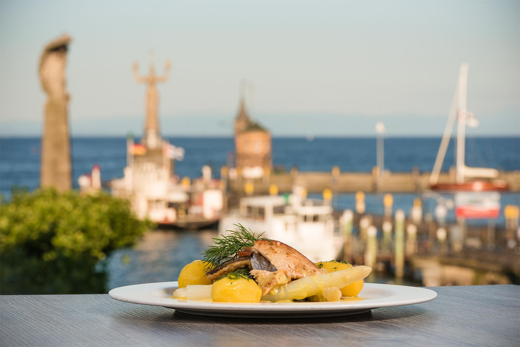 Konstanz: Fischgericht vor der Kulisse des Hafens. Foto: mtk/ Chris Danneffrel