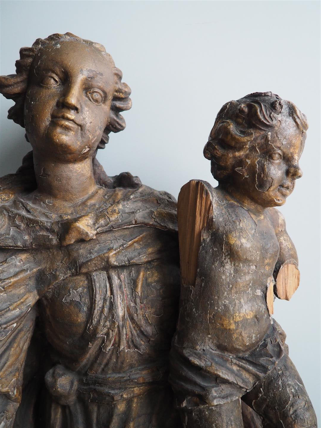 Madonna mit Kind, Holz, Bemalungs- und Vergoldungsfragmente, 18. Jahrhundert.