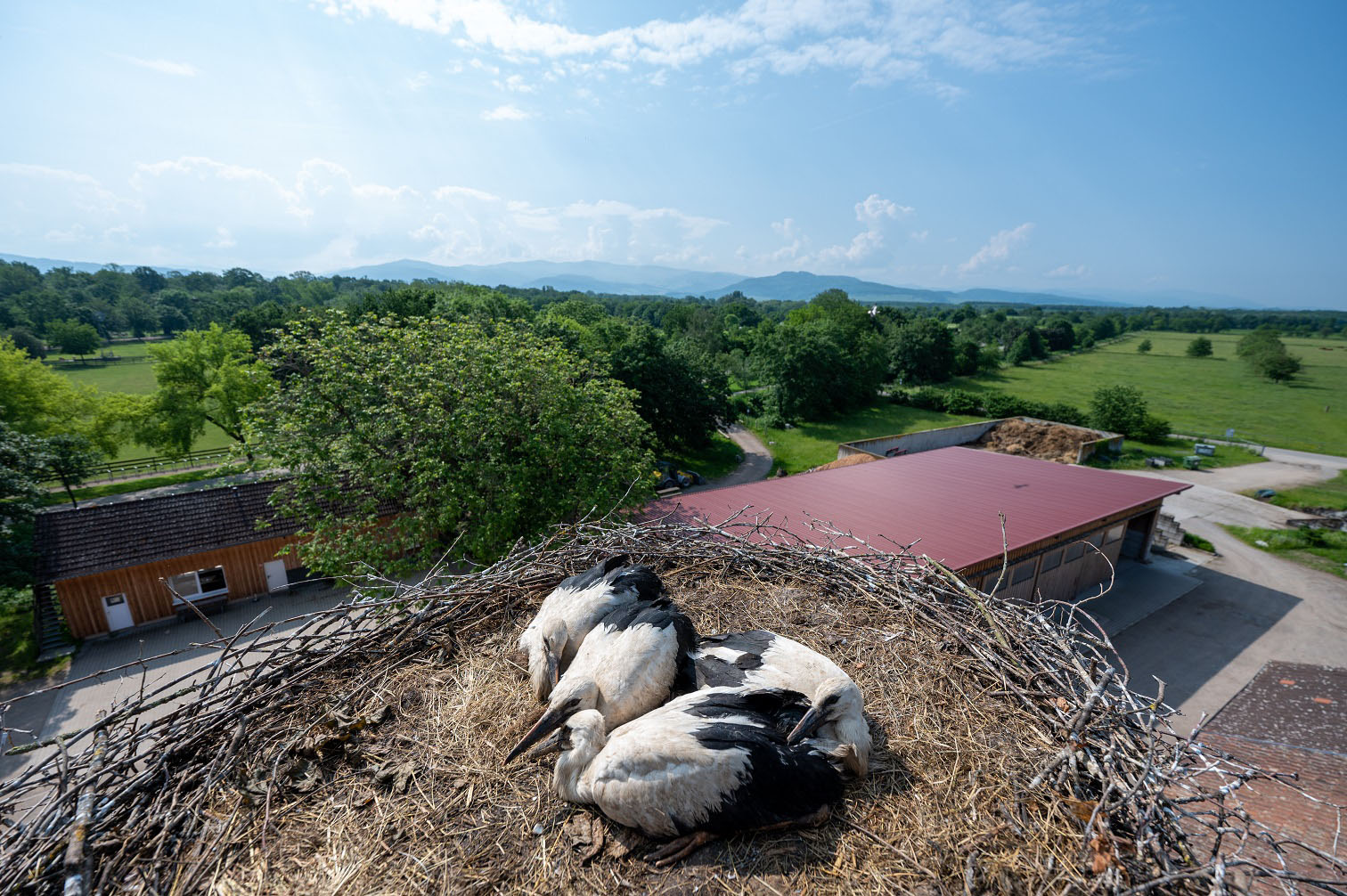 Die Störche, die Ende Februar aus ihrer Winterpause zurückgekehrt sind, fühlen sich offensichtlich sehr wohl auf dem Mundenhof. Die bereits vorhandenen Nester sind bis auf eines komplett belegt. Ein Storchenpaar, das sein eigenes Heim gebaut hat, brauchte so lange, dass ihr Storchenküken nun als Nesthäkchen auf dem Hof gilt. Storchenoma Lisa hingegen ist bereits 32 Jahre alt und lebt mit ihrem jüngeren Partner auf einem Holzmast bei der Pferdeweide. Seit einigen Jahren hat sie keine eigenen Nachkommen mehr. Dafür haben die meisten der anderen Paare, die seit Jahren auf dem Hof brüten, in der Regel drei Jungvögel.