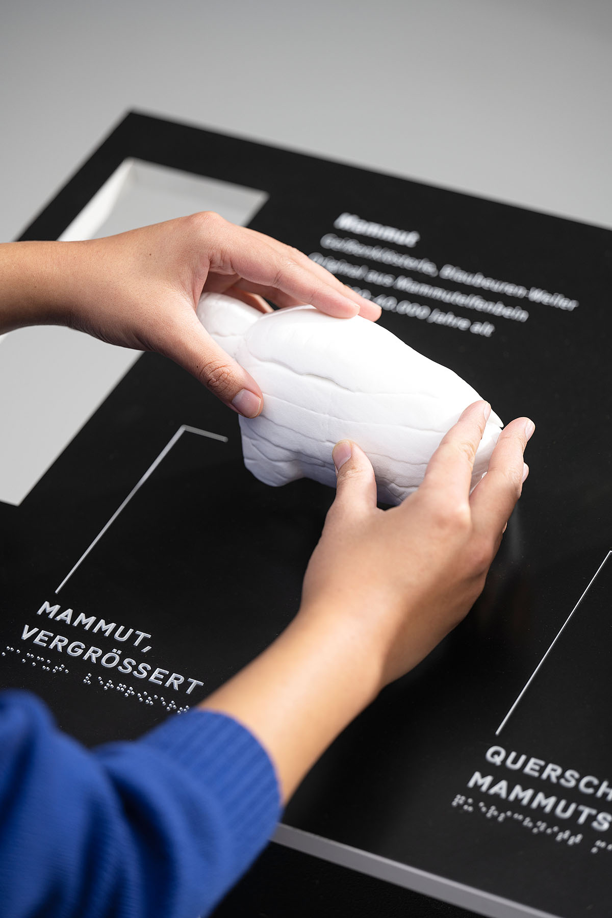 Am Original kaum noch erkennbare Details der Tier- und auch Menschendarstellungen werden in Tastobjekten herausgearbeitet und lassen sich damit auch visuell besser wahrnehmen. Die verwendeten Werkzeuge und das als Ausgangsmaterial für die meisten Figuren verwendete Mammutelfenbein werden ebenfalls haptisch erfahrbar. Ergänzende Hör- und Riechstationen lassen die Altsteinzeit und ihre ausdrucksstarke Kunst zusätzlich lebendig werden. Für alle Besucher*innen entsteht so im Ganzen ein spannendes, mit mehreren Sinnen erlebbares Angebot.