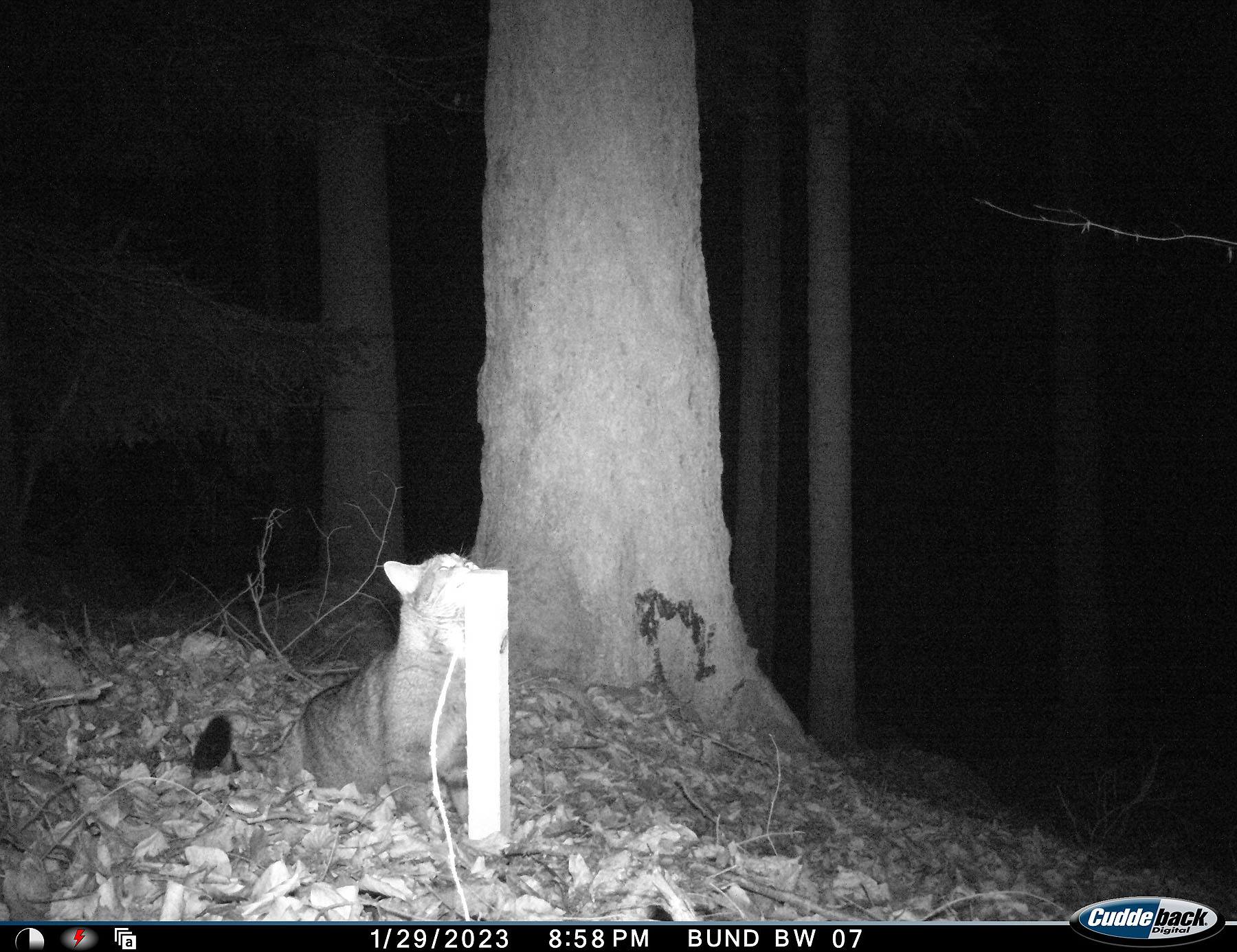 Eine Katze markiert einen Lockstock im Neckar-Odenwald-Kreis. Ob es sich um eine Wildkatze handelt, wird anschließend durch eine Haaranalyse ermittelt. Foto: BUND BW.