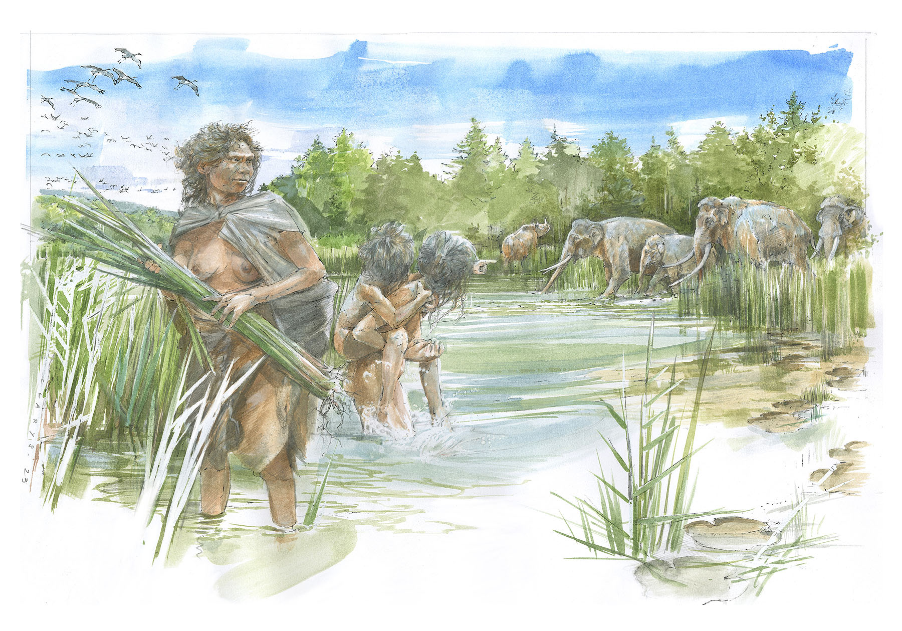 In einem von Gräsern bewachsenen offenen Birken- und Kiefernwald liegt ein wenige Kilometer langer und einige hundert Meter breiter See. An dessen schlammigen Ufern finden sich Herden von Elefanten, Nashörnern und Paarhufern ein, um zu trinken oder zu baden. Inmitten dieser Szenerie steht eine Kleinfamilie der „Heidelberger Menschen“, einer heute ausgestorbenen Menschenart. „So oder so ähnlich könnte es vor 300.000 Jahren im niedersächsischen Schöningen ausgesehen haben“, erläutert der Erstautor der heute veröffentlichten Studie Dr. Flavio Altamura, Stipendiat vom Senckenberg Centre for Human Evolution and Palaeoenvironment an der Universität Tübingen (SHEP) und fährt fort: „Wir haben erstmalig die fossilen Fußabdrücke von zwei Fundorten in Schöningen detailliert untersucht. Diese Spuren liefern uns, zusammen mit den Informationen aus sedimentologischen, archäologischen, paläontologischen und paläobotanischen Analysen, Erkenntnisse über die Paläoumwelt und die einst in diesem Gebiet lebenden Säugetiere. Unter den Abdrücken befinden sich auch drei Spuren, die mit Fußabdrücken von Homininen übereinstimmen – mit einem Alter von etwa 300.000 Jahren sind sie die ältesten in Deutschland bekannten menschlichen Spuren und stammen wahrscheinlich von Homo heidelbergensis.“