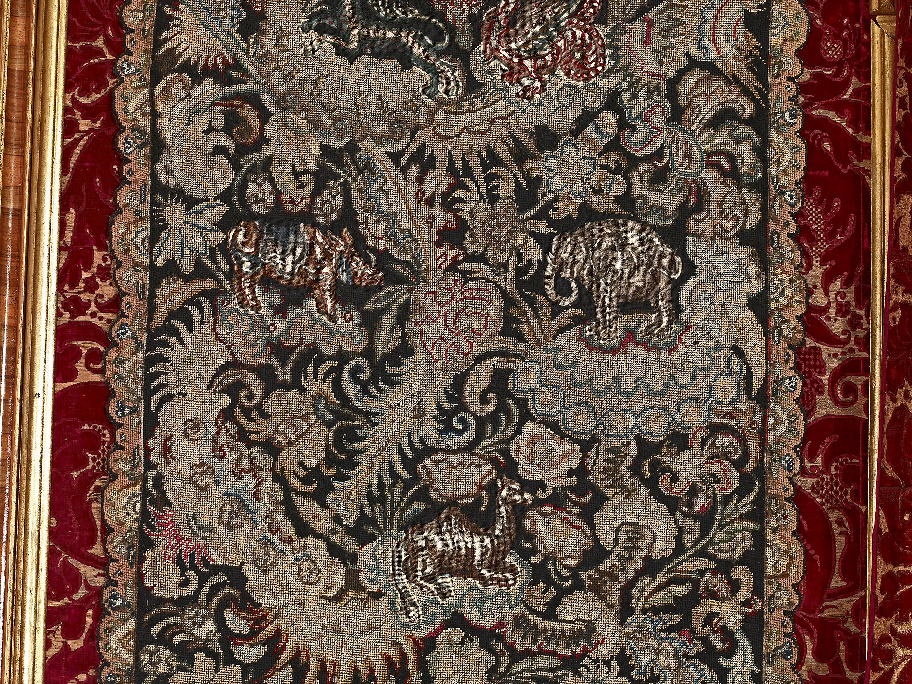 Schloss Favorite, Wandbehang im Audienzzimmer der Markgräfin mit Nashorn. Foto: Andrea Rachele, LMZ/ssg