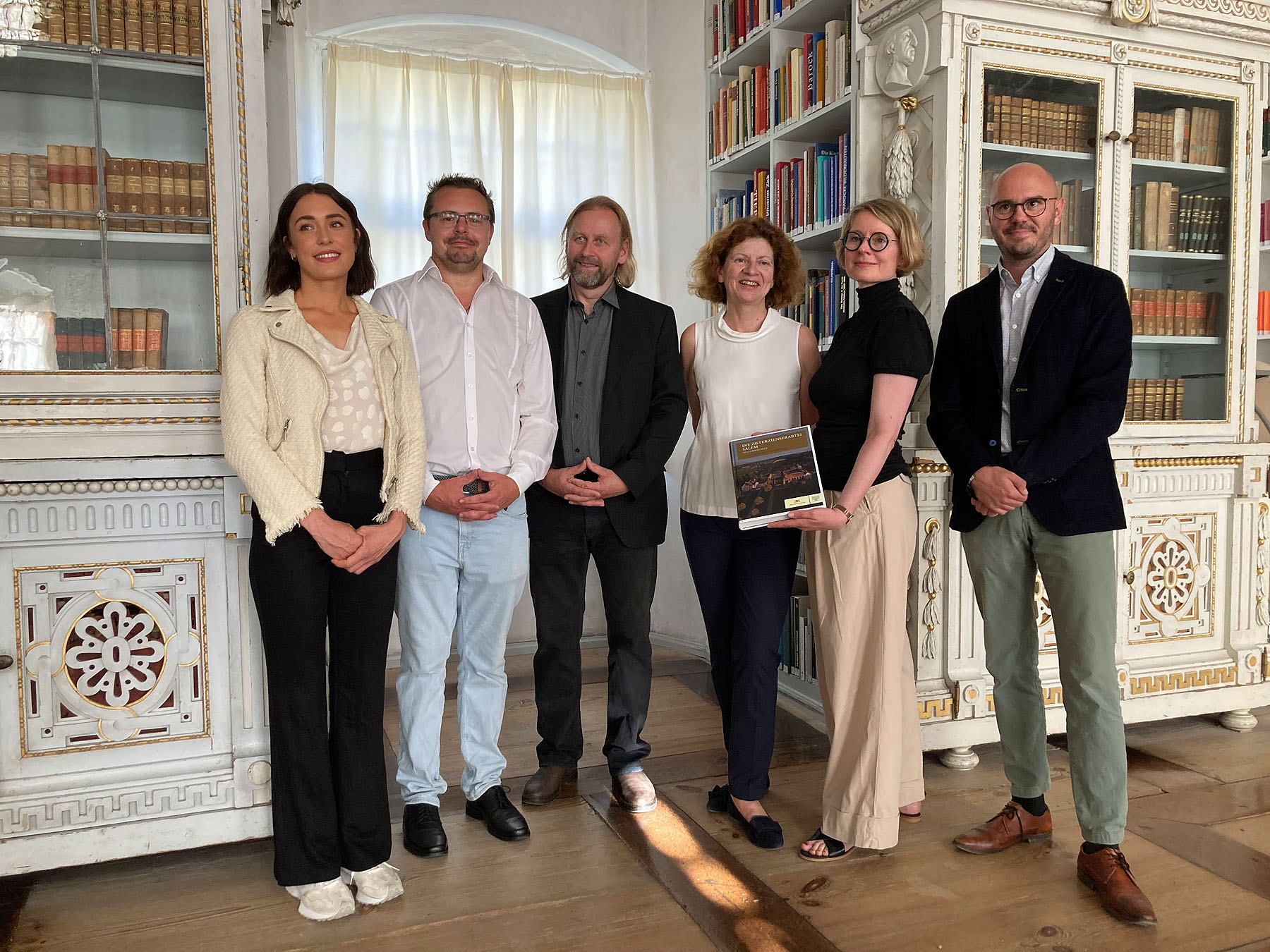 Buchpräsentation in der Bibliothek des Klosters Salem. Von links nach rechts: Charlott Hannig (wissenschaftliche Mitarbeiterin Universität Kiel), Matthias Baumgartner (Vertriebsleiter Kunstverlag Josef Fink), Prof. Dr. Klaus Gereon Beuckers (Universität Kiel), Dr. Birgit Rückert (Leiterin der Schlossverwaltung Salem), Patricia Alberth (Geschäftsführerin der Staatlichen Schlösser und Gärten Baden-Württemberg und Dr. Christian Katschmanowski (Konservator bei den Staatlichen Schlösser und Gärten Baden-Württemberg zuständig für die Region Bodensee/Oberschwaben).