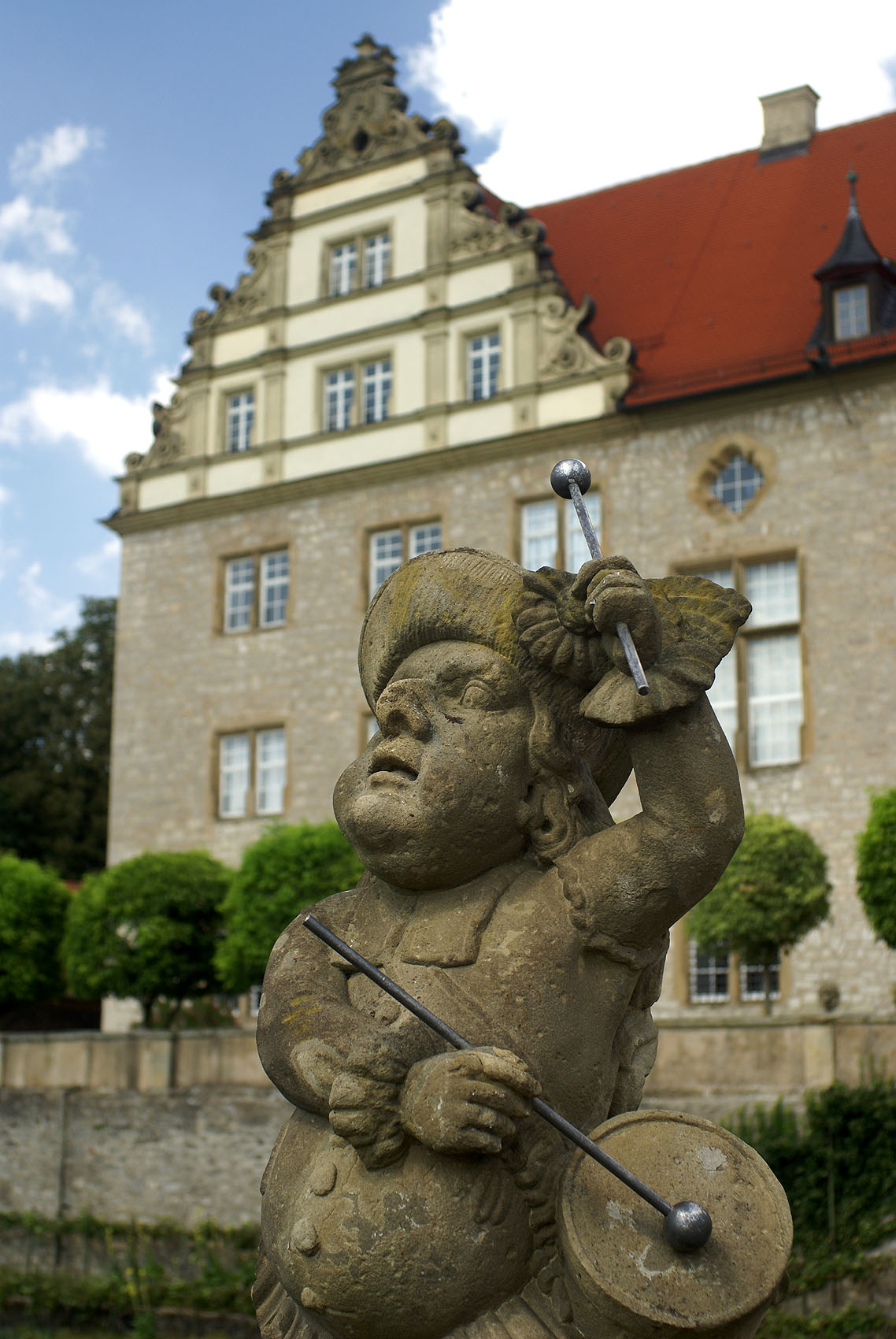 Schloss Weikersheim. Zwergenfigur "Trommler" vor dem Renaissancegiebel des Schlosses.