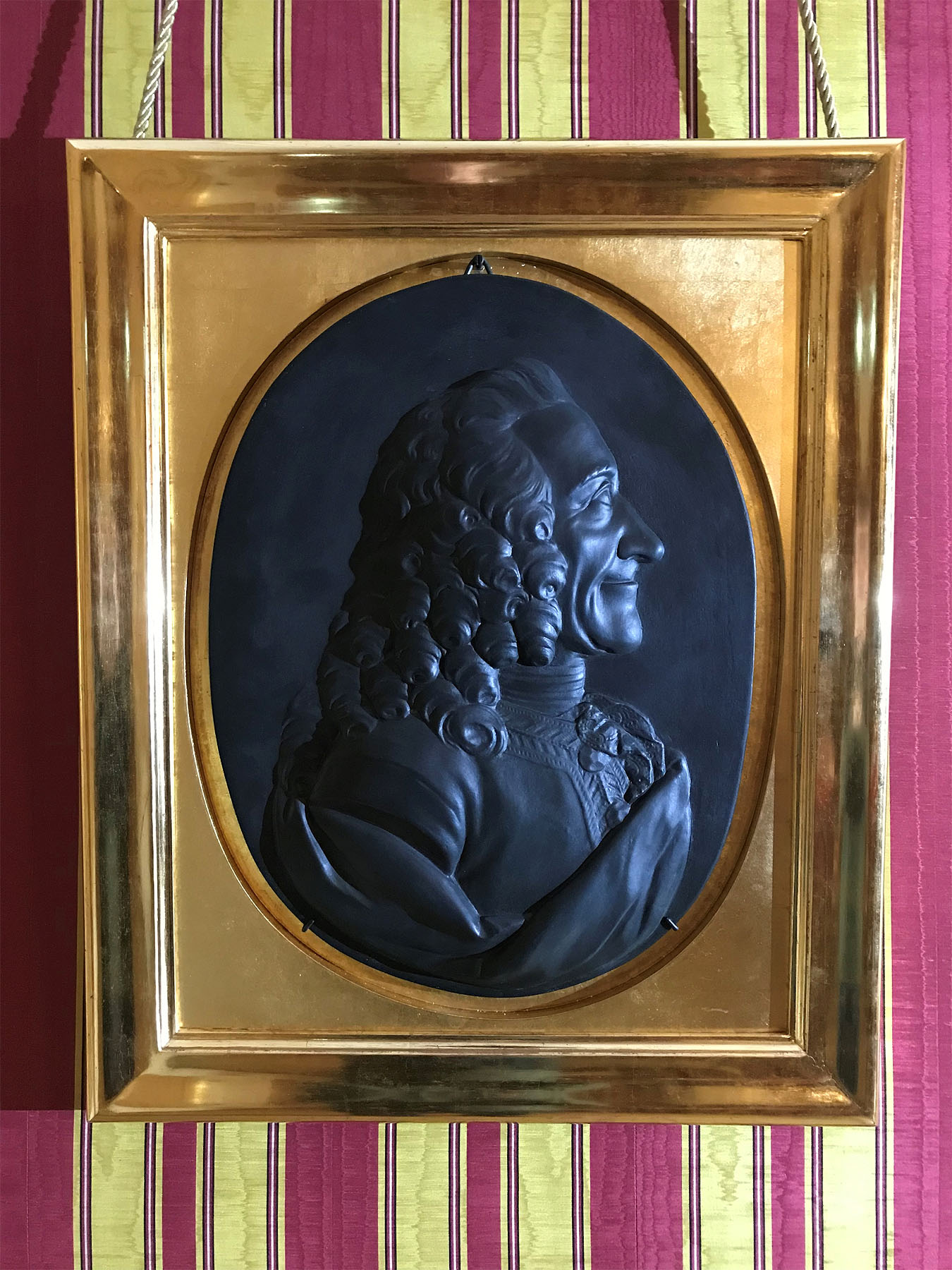 Unter den Ankäufen sind zwei bemerkenswerte, schwarz gefärbte, flache Reliefs aus Gips. Sie zeigen die Konterfeis Kurfürst Carl Theodors und des Philosophen Voltaire. „Die Reliefs sind Teil eines exklusiven Paares von weltweit nur zwei bekannten Exemplaren dieses Typs“, berichtet Dr. Ralf Wagner, der Schloss und Schlossgarten Schwetzingen konservatorisch betreut. Geschaffen hat die außergewöhnlichen Werke im Jahr 1770 Hofbildhauer Conrad Linck nach einer Vermittlung durch Collini, den Sekretär Voltaires. Neu gerahmt hängen sie nun im Konferenzzimmer des Schlosses. Und damit am Original-Schauplatz bedeutender Gespräche, die hier 1753 und 1759 zwischen dem Kurfürsten und dem berühmten Philosophen stattgefunden haben. Dr. Ralf Wagner ergänzt: „Das macht sie zu einer wahren Sensation und zu einem unschätzbaren kulturgeschichtlichen Schatz für Schloss Schwetzingen.“ Erworben haben die Staatlichen Schlösser und Gärten die Reliefs aus einer Schweizer Privatsammlung.