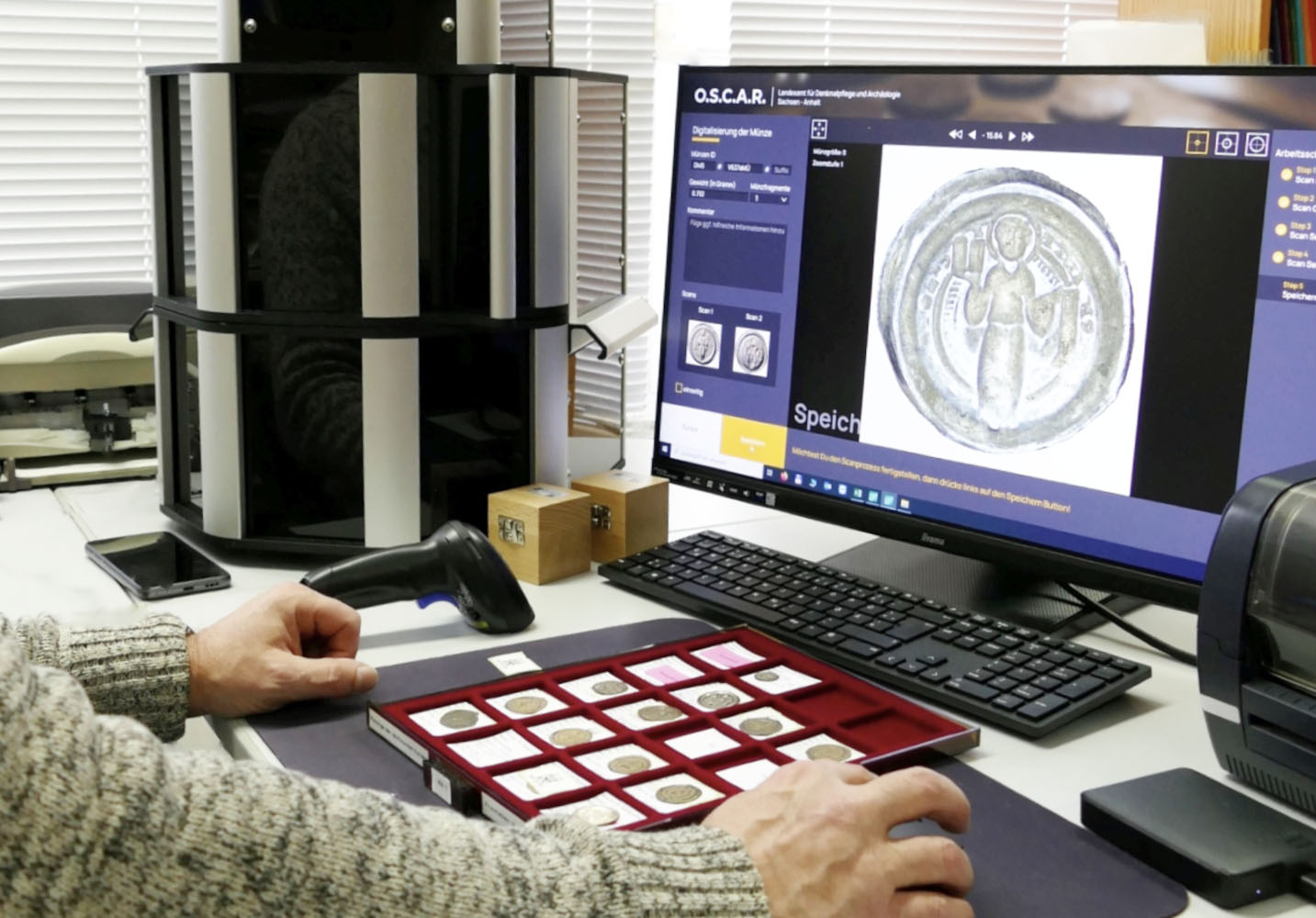 Fundmünzerfassung mit ›O.S.C.A.R.‹ vor Ort in einem teilnehmenden Museum. Foto: Anna Wendt, Landesamt für Denkmalpflege und Archäologie Sachsen-Anhalt