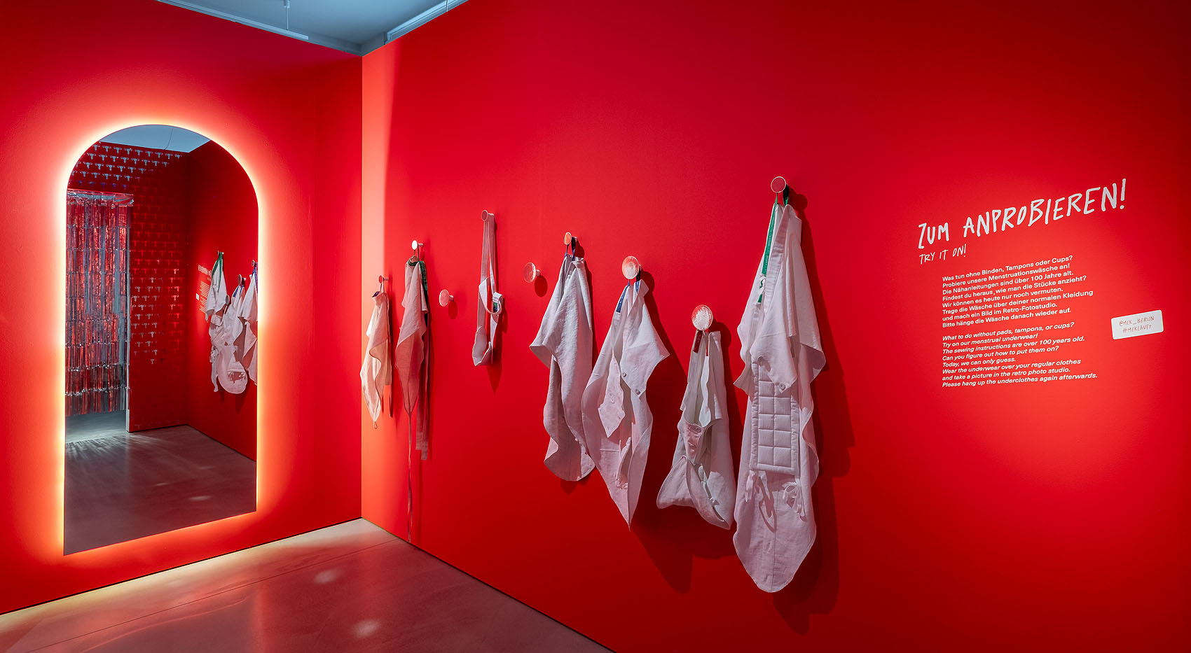Der Themenbereich „Geschichte der Unterwäsche und der Menstruationsprodukte“ behandelt die Entwicklung und Vermarktung speziell konzipierter Menstruationsprodukte seit der Mitte des 19. Jahrhunderts. Für alle heute verfügbaren Menstruationsartikel gab es bereits vor 100 Jahren Vorläufer; zugleich blieben DIY(Do It Yourself)-Lösungen bis in das späte 20. Jahrhundert weit verbreitet. Ein „Fotostudio“ ermöglicht es Besucher*innen, Modelle historischer „Wäsche für besondere Tage“ anzuprobieren und so am eigenen Körper zu erfahren, was sich über Jahrzehnte verändert hat.