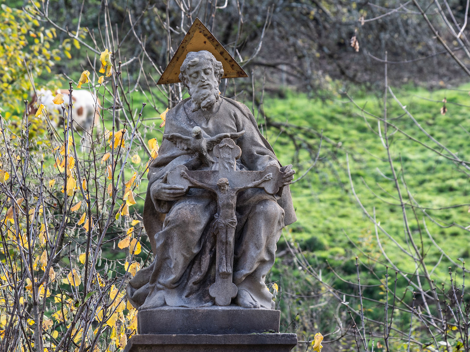 Bildsäule „Dreifaltigkeitssäule“ Stegen-Eschbach Breisgau-Hochwarzwald, 1770 (Bernd Ebbmeyer, Freiburg). Gnadenstuhl als Motiv der Dreifaltigkeit, Gott Vater, auf der Erdkugel thronend, hält das Kreuz mit Christus mit der Taube als Symbol für den Heiligen Geist. Geschaffen hat die Dreifaltigkeitssäule 1770 der Freiburger Bildhauer Franz Anton Xaver Hauser (1739-1819) aus Pfaffenweiler Sandstein. Gestiftet wurde die Bildsäule von Peter Humel und sein Frau Agatha Hauerin. Sie sind als Stifter auf der Sockelinschrift angegeben.