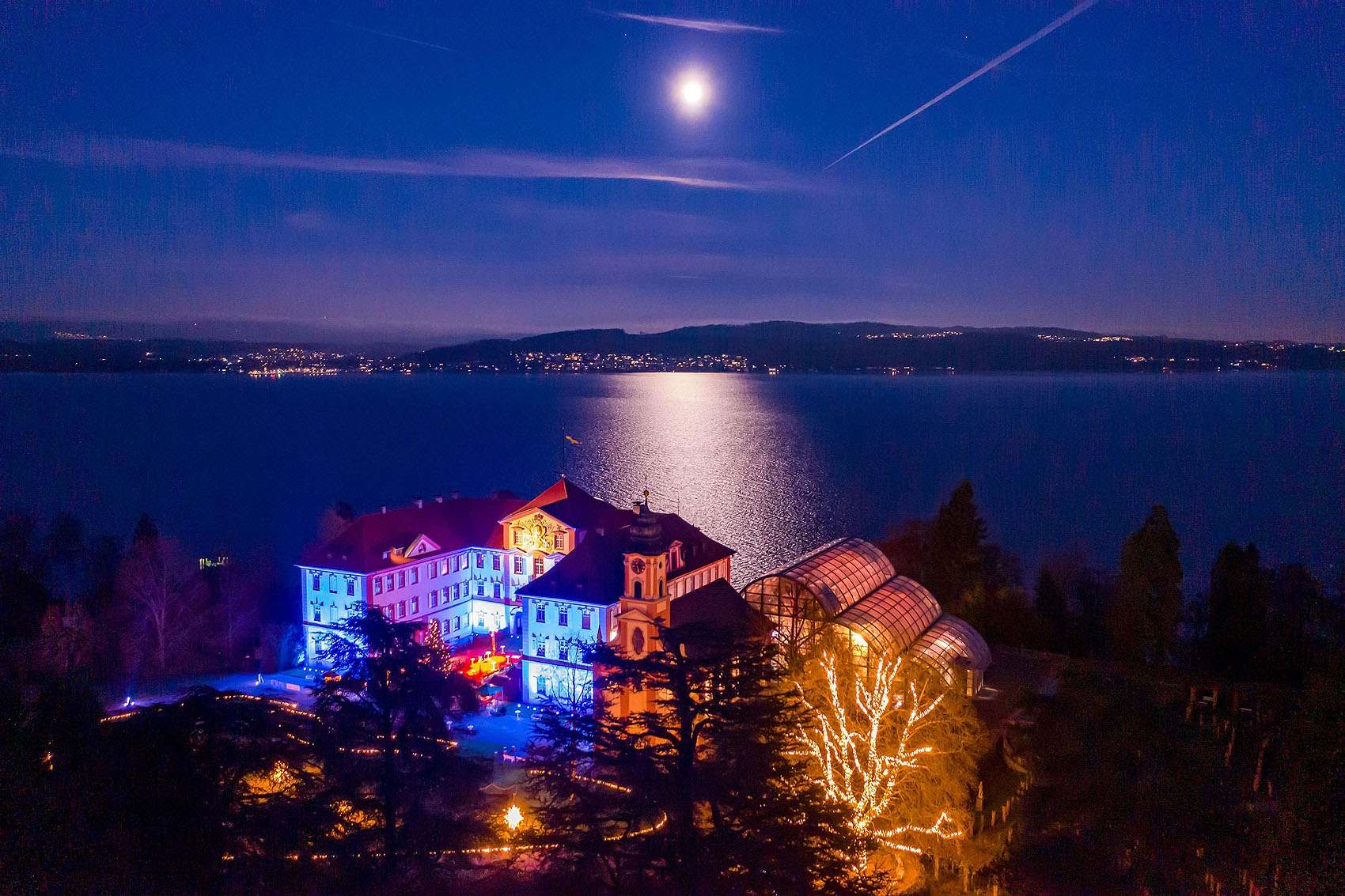Insel Mainau, Schloss in Weihnachtsbeleuchtung. Foto: MTK/Achim Mende.