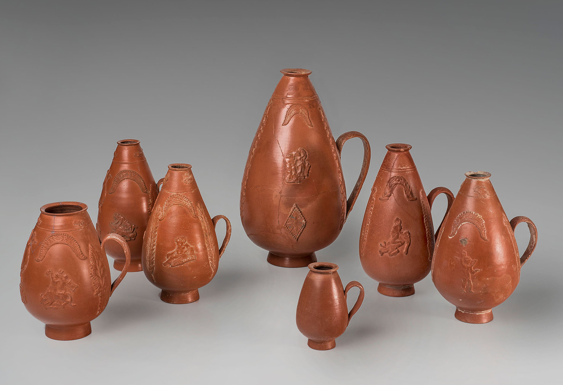 In unterschiedlichen Größen beliebt: birnenförmige Krüge mit einem Henkel. Ihr Applikendekor