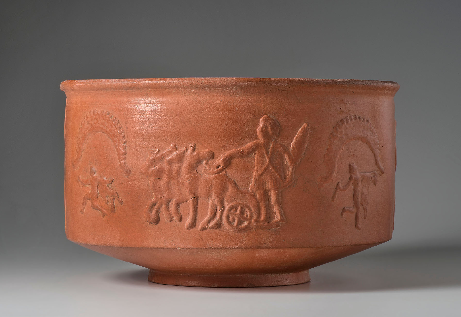 Die Schüssel ziert die Darstellung eines siegreichen Wagenlenkers. Die Reliefs wurden Modeln geformt und auf den getöpferten Gefäßkörper appliziert; spätes 2./ frühes 3. Jh. n. Chr.; hergestellt wohl in Nordosttunesien.