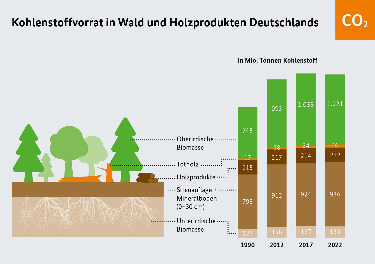 Weniger Kohlenstoffvorrat: Seit 2017 ist der Wald vor allem durch den klimawandelbedingten Verlust an lebender Biomasse zur Kohlenstoff-Quelle geworden. Aktuell sind 1.184 Millionen Tonnen Kohlenstoff oder 108 Tonnen Kohlenstoff je Hektar in den lebenden Bäumen und 46,1 Millionen Tonnen oder 4,2 Tonnen je Hektar im Totholz gebunden. Weitere 936 Millionen Tonnen Kohlenstoff sind nach Ergebnissen der Bodenzustandserhebung in Streu und Mineralboden eingelagert. Insgesamt sind also rund 2.200 Millionen Tonnen Kohlenstoff im Wald gespeichert. Der Kohlenstoffvorrat der lebenden Biomasse im Wald hat im Vergleich zur letzten BWI 2012 zwar um ein Prozent zugenommen. Seit der Kohlenstoffinventur 2017 ging er allerdings um 41,5 Millionen Tonnen oder drei Prozent zurück. Da der Kohlenstoffverlust in der lebenden Biomasse in den Jahren 2017 bis 2022 höher war als die Zunahme beim Totholz und auch der Boden nicht mehr Kohlenstoff gespeichert hat, ist der Wald in diesem Zeitraum zu einer Quelle für Kohlendioxid geworden.