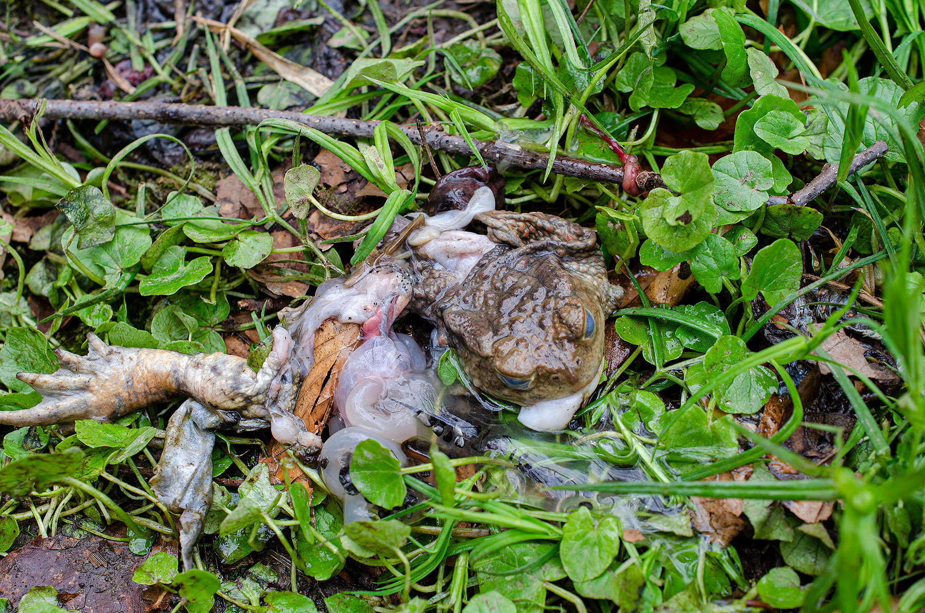 Von einem Waschbären erlegte und halb gefressene weibliche Erdkröte. Der noch in der Kröte befindliche Laich wurde bevorzugt aufgenommen. Foto: Norbert Peter, ZOWIAC