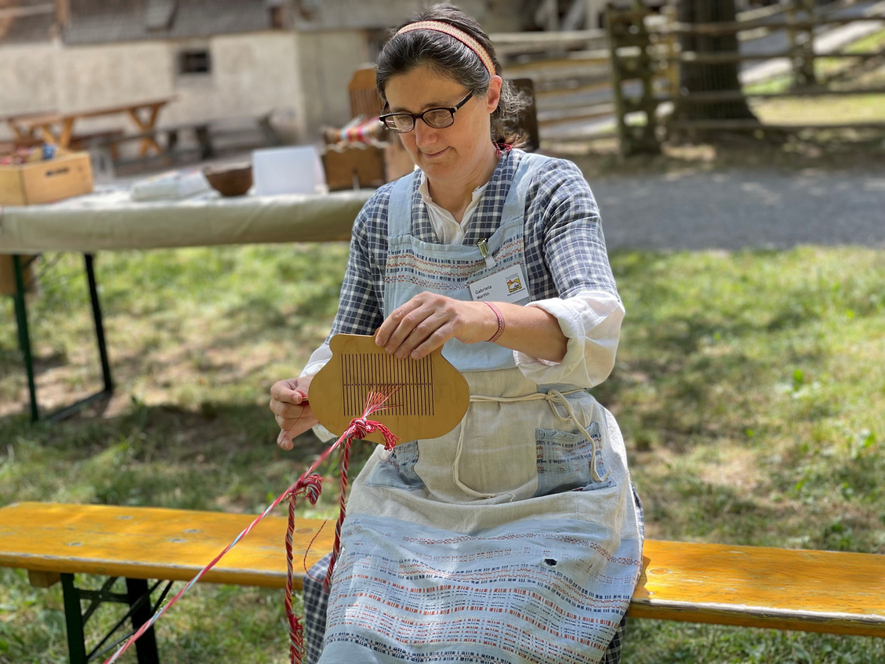 Webmeisterin Gabriela Martin bei der alten Handarbeitstechnik des Bandwebens. Foto: Schwarzwälder Freilichtmuseum Vogtsbauernhof, Tamara Vogt