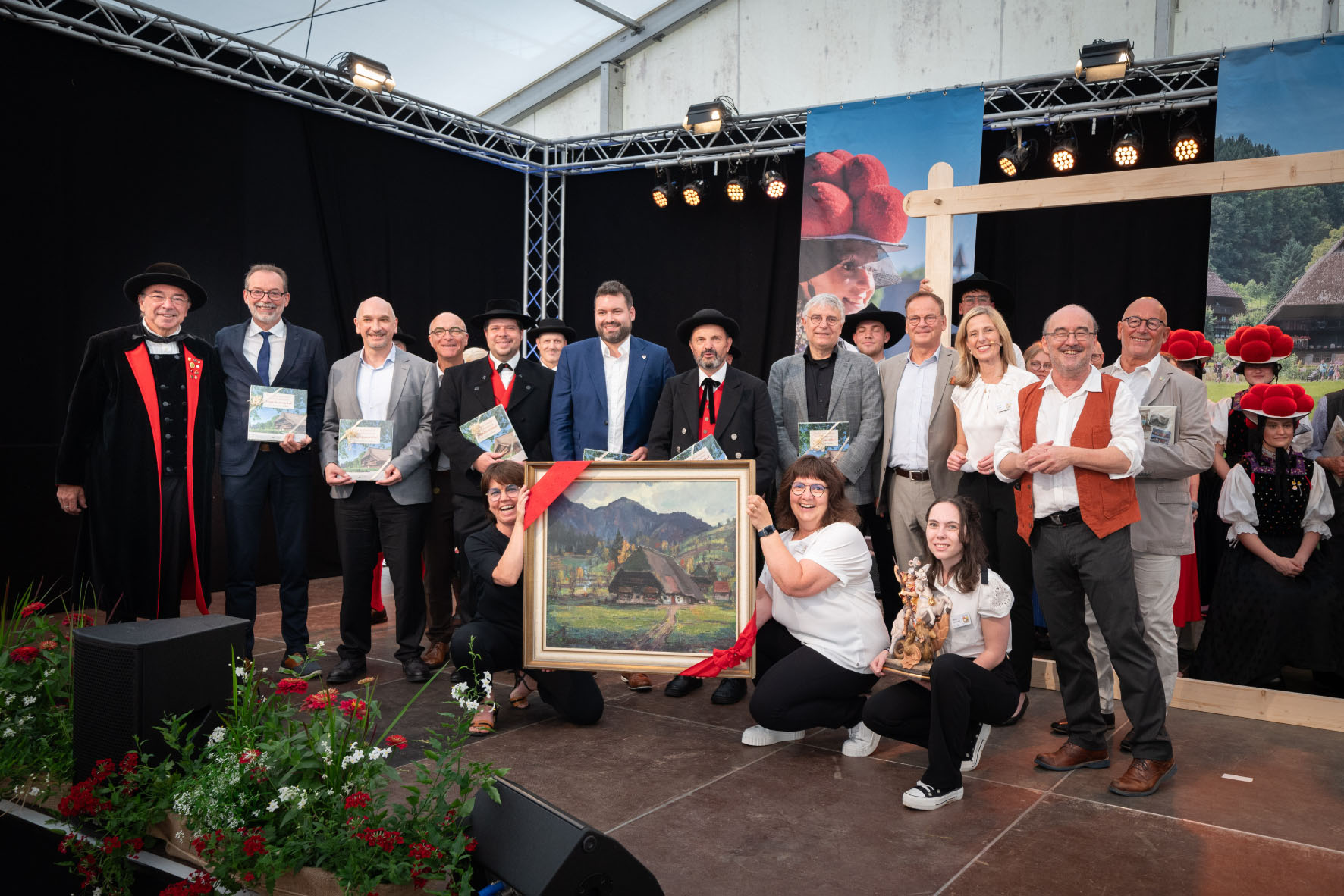 Rund 500 Gäste feierten am vergangenen Sonntag, den 30. Juni 2024, beim feierlichen Festakt um 11 Uhr im großen Festzelt das 60-jährige Bestehen des Schwarzwälder Freilichtmuseums Vogtsbauernhof in Gutach. Zahlreiche Wegbegleiter und Freunde des Museums sowie viele Vertreter aus Politik, Tourismus und Wirtschaft waren gekommen, um dem ältesten Freilichtmuseum Baden-Württembergs zu diesem besonderen Jubiläum ihre Ehre zu erweisen. Der Landrat des Ortenaukreises, Frank Scherer, sowie Staatssekretär Arne Braun vom Ministerium für Wissenschaft, Forschung und Kunst Baden-Württemberg, hoben in ihren Grußworten die besondere Bedeutung und die beeindruckende Entwicklung der Einrichtung hervor. Für den Verein „Freunde und Förderer des Freilichtmuseums“, der vor genau zehn Jahren gegründet wurde, sprach der Vereinsvorsitzende Gerd Baumer. Der Gutacher Bürgermeister Siegfried Eckert gratulierte mit der Übergabe eines Gemäldes von Wilhelm Kimmich im Namen der sieben Kommunen, aus denen die großen historischen Hofgebäude im Freilichtmuseum stammen: Das sind neben Gutach Furtwangen, Oberwolfach, Buchenbach-Wagensteig, Elzach, Wildberg und Durbach, deren Bürgermeister als Ehrengäste beim Festakt vertreten waren.