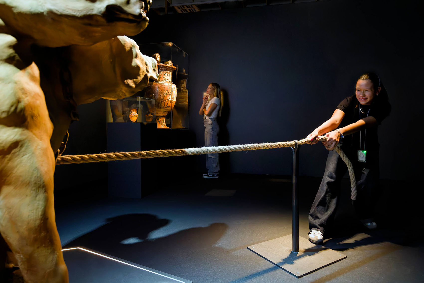 In der Unterwelt, im dunklen Reich der Schatten, wacht der dreiköpfige Kerberos über die Pforte zu Hades‘ modrigem Reich. Unsere Besucher*innen wagen sich wie einst Herakles im Dienst von König Eurystheus in die dunklen Tiefen und versuchen, den unbezwingbaren Kerberos zu bändigen. Mit aller Kraft ziehen sie an seiner Leine und müssen sich dabei seinem dreistimmigen Bellen und seinem furchteinflössenden Aussehen stellen.