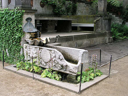 Eingangsbereich: Brunnen mit wasserspeiendem Butt und antikem Kentaurensarkophag
