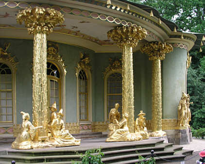 Säulenvorhalle, getragen von vier Palmettensäulen, die von jeweils zwei sitzenden oder liegenden Figuren (Johann Peter Benckert und Johann Gottlieb Heymüller) umlagert sind.