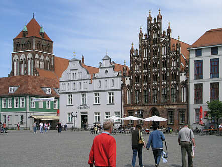 Links das Doppelhaus Markt 10, beim Umbau zweier spätmittelalterliche Wohnspeicherhäuser 1661 mit barocken Giebeln versehen, Erdgeschoss 1912/14 neu gestaltet. Rechts (Markt 11) Wohnspeicherhaus um 1400, mit besonders reichem Schaugiebel.