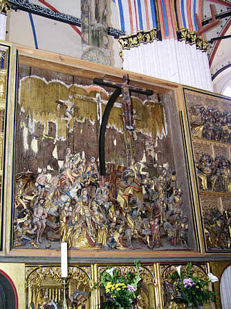 Hochaltar im Chor Mittelschrein mit der Darstellung des Kalvarienbergs (Kruzifixus im Krieg zerstört, modern ergänzt) Predella mit Szenen der Verkündigung, Geburt und Beschneidung Christi. Stralsunder Werkstatt, um 1470