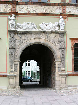 Darüber der 1975-80 erneuerte ehem. Kalkstuckfries mit Szenen