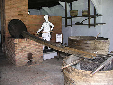 1736 als Brautschatz der Catharina Kramer auf dem Hof Hubbermann erbauter Wandständerbau mit gemauerten Braukessel. Im Vordergrund der Zuber mit einem Einsatz aus Weidengeflecht als Sieb.