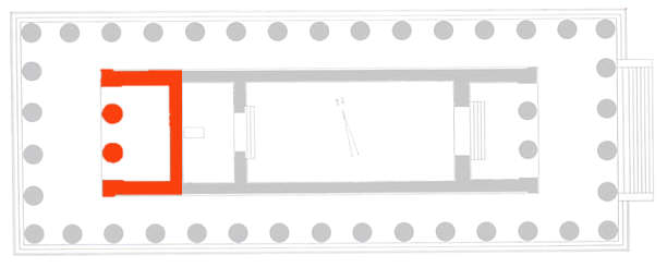 Dem Pronaos der Vorderseite entsprechender Raum auf der Rückseite der Cella, gebildet aus zwei Anten, mit einem Säulenpaar als Stütze des Gebälks