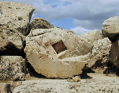 Die Säulentrommeln wurden durch Zapfen in ihrer Lage fixiert Im Bild: Säulentrommel vom Tempel F, Selinunt