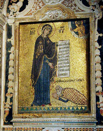 Mosaik im Vorraum des Narthex: Großadmiral Georg von Antiochien, der Kirchengründer, huldigt der Muttergottes.