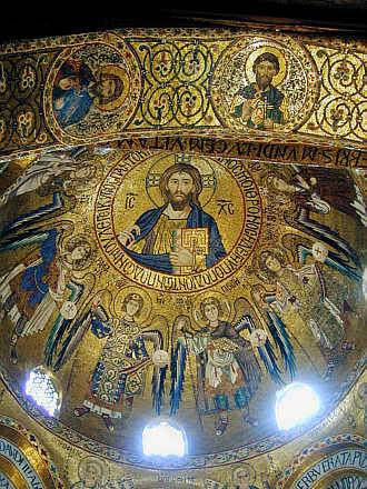 Kuppelmosaik: Christus Pantokrator, umgeben von der griechischen Inschrift "Der Himmel ist mein Thron, die Erde der Schemel für meine Füße". Darunter vier Erzengel und vier Engel in byzantinischen Ornaten oder in Rüstungen.