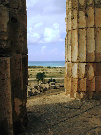 Säulen der Südseite: Putzreste an der vorderen Säule, dahinter Restaurierungen der Neuaufstellung 1957.
