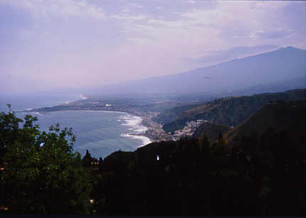 Blick von der Höhe des griech.-römischen Theaters auf den Strand von Giardini-Naxos und den Ätna. Aufnahme 1984