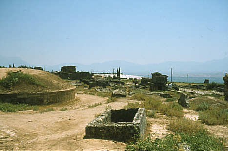 Links ein Tumulus, rechts ein Kammergrab, im Hintergrund hausförmige Gräber