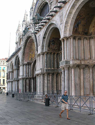 Westportale Das mittlere Westportal ist größer und höher als die übrigen vier und stößt durch die oben begrenzende Balustrade. Es wird zusätzlich durch die Quadriga, die vier 1204 auf Konstantinopel geraubten Bronzepferde, betont.