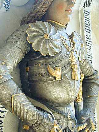 Ein stolzer Ritter in seiner RüstungOberkörper des Ritters Georg Sack: Großaufnahme: Brustpanzer mit Harnischkragen, Schwebescheibe und Rüsthaken; Armzeuge mit Ellenbogenkacheln und Handschuhen |