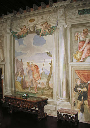 Fresko von Gianbattista Zelotti: Ionische Säulenordnung, in den breiten Zwischenräumen Szenen aus der antiken Mythologie