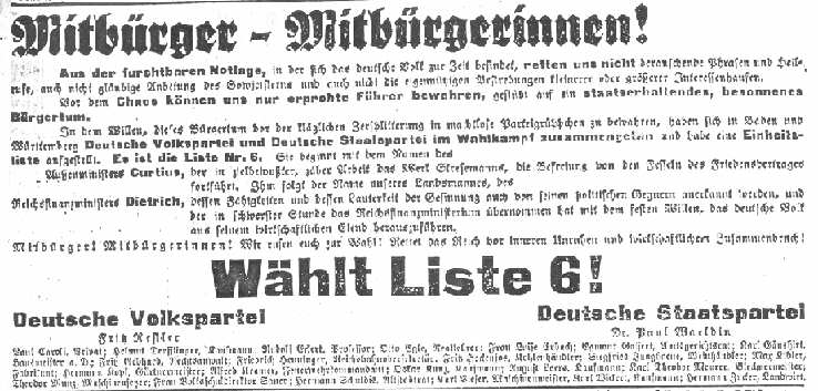 Wahlbündnis des Deutschen Volkspartei und der Deutschen Staatspartei (ehemals DDP)