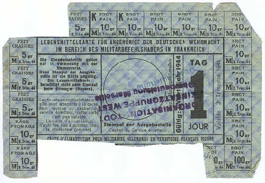 Lebensmittelmarken für Wehrmachtsangehörige im Bereich des Militärbefehehlshabers in Frankreich 3. Vierteljahr (Juli - September) 1944, gültig für Brot, Fett und Käse. Stempel der Organisation Todt, Einsatzgruppe West