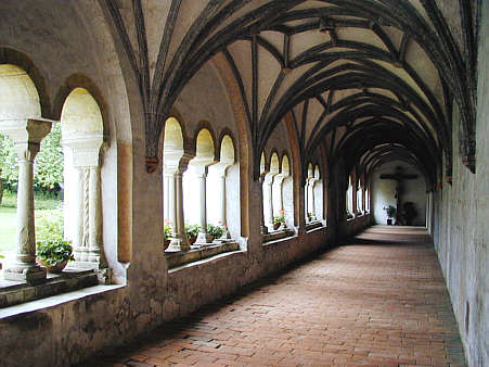 Vom romanischen Kreuzgang aus der 1. Hälfte des 13. Jahrhunderts ist nur der Westflügel erhalten. Er wurde im 15. Jahrhundert eingeölbt. Hinten links der Eingang zum Brunnenhaus.